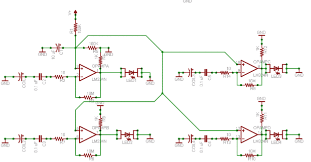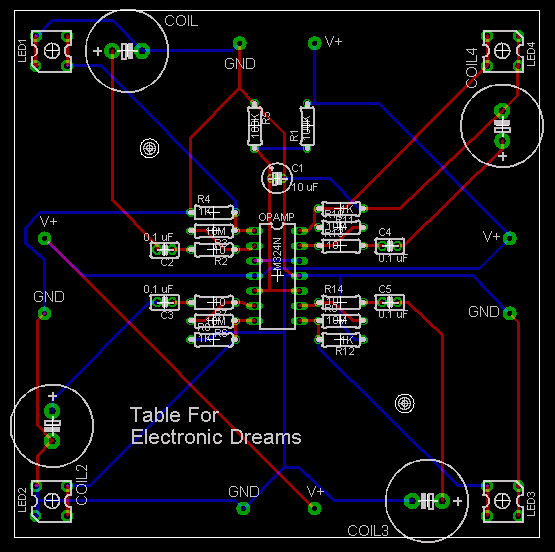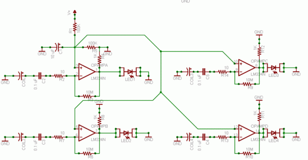 Básicamente la bobina recoge una tensión, que es amplificada por el amplificador operacional, que conduce un LED.