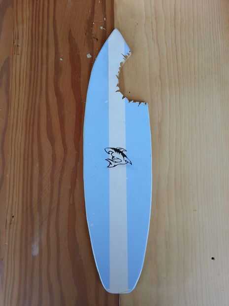 Aerosol la tabla de surf con una capa final de uretano para protección. HECHO!  Ahora usted puede mostrar su encuentro cercano con el tiburón!