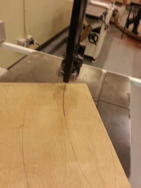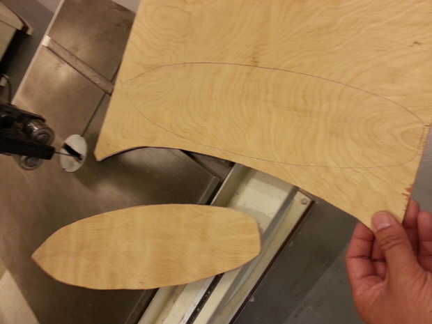 Ajuste la sierra a la altura de trabajo apropiada y corta la tabla de surf siguiendo el contorno de la plantilla.  Está bien si el corte no es totalmente liso.  Se forma la Junta siguiente.