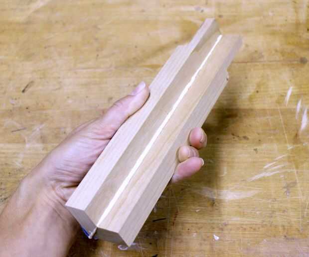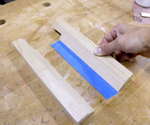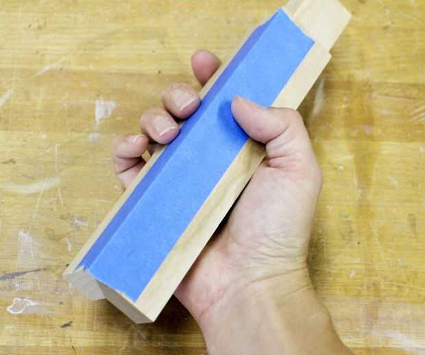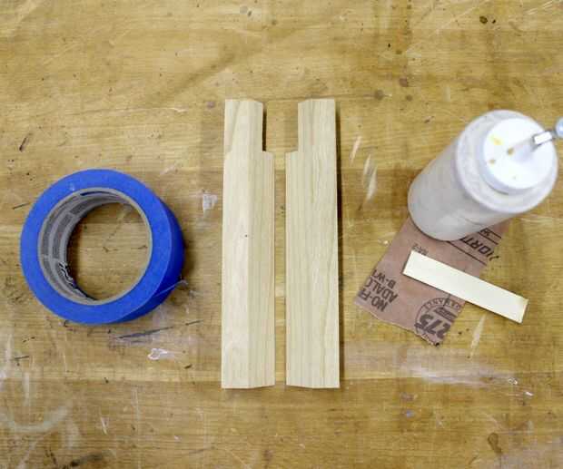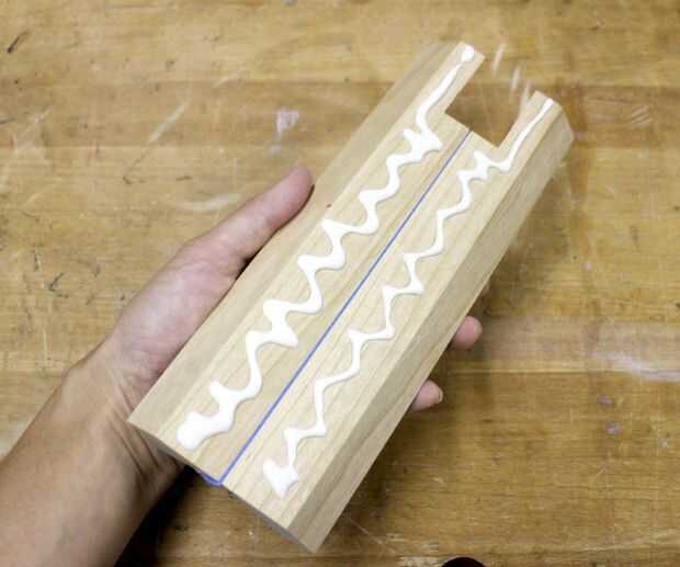 Abrir las piezas de arriba (la cinta actuará como una bisagra) y pegamento de madera en ambas las superficies interiores.