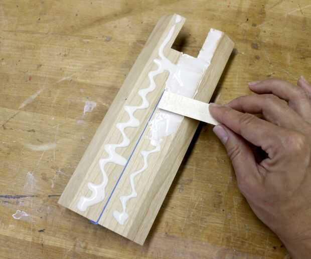 Presione las piezas de nuevo juntos, quitar exceso de cola con un palillo o una pieza de cartón y utilizar más cinta de pintor para sujetar las piezas juntos.