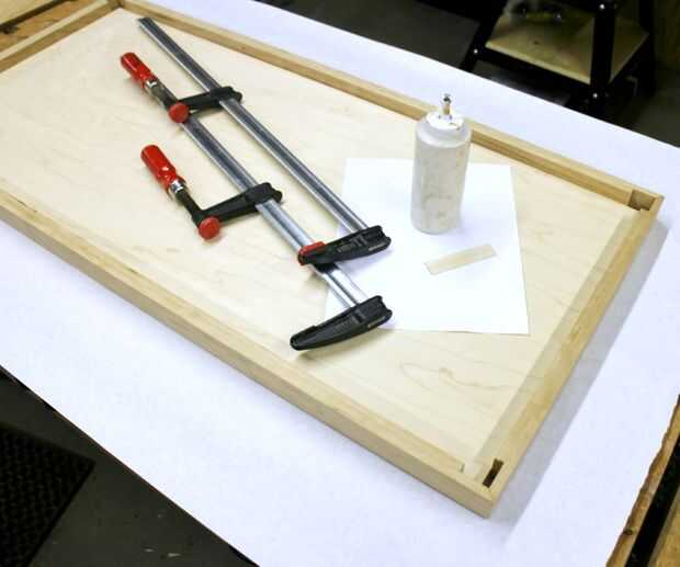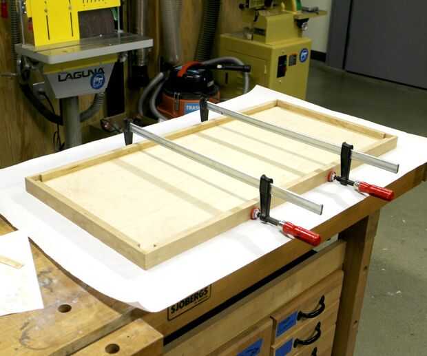 Coloque el marco sobre un pedazo grande de papel de desecho. Pegar los bordes de la madera contrachapada, presiónela en su lugar todo el camino hasta la superficie de trabajo y abrazadera para que se seque.
