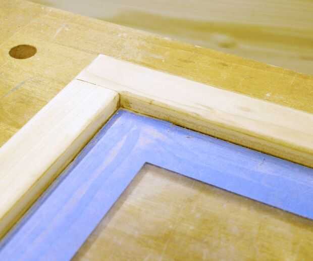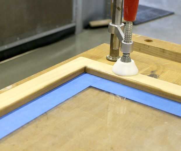 Para llegar a la madera cruda, sujete suavemente la puerta de un banco de trabajo y poner una tira de cinta de pintor ancha por el borde del vidrio.