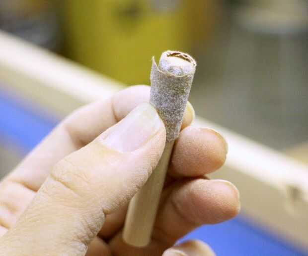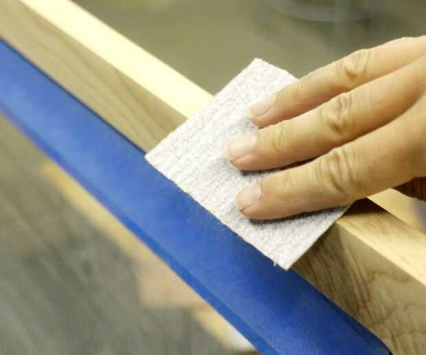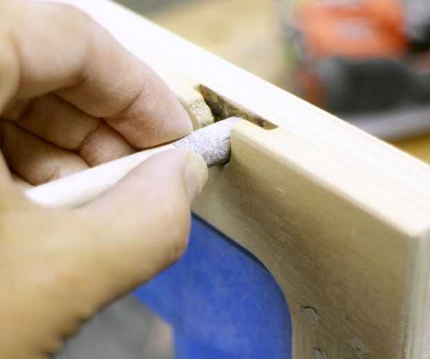 Para llegar a las áreas de margen dejado por el retiro del hardware de la puerta, envolvió un poco de papel de lija alrededor del extremo de un pequeño taco.