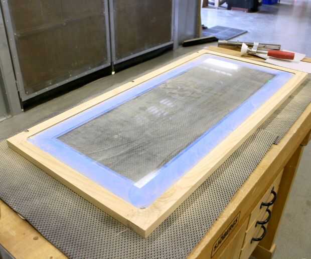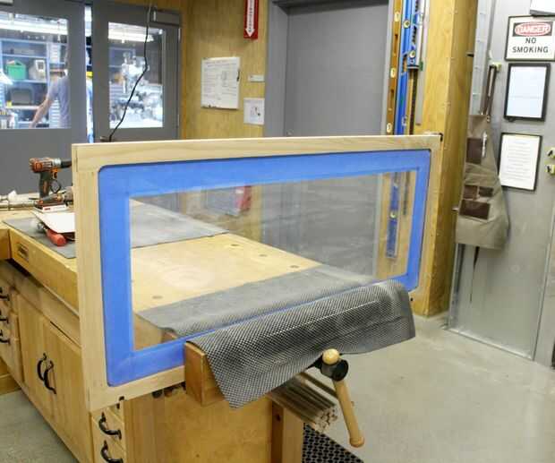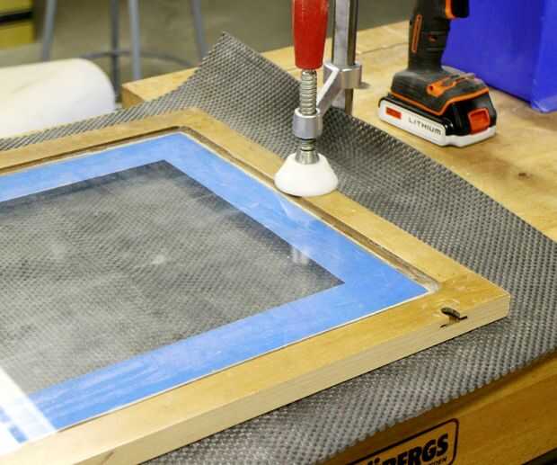 Voltee la puerta y coloque sobre una superficie suave de algún tipo (estera de fieltro, tela o goma) para proteger la madera nueva materia prima de la parte delantera. Luego con cinta adhesiva el borde de la parte posterior del vidrio.
