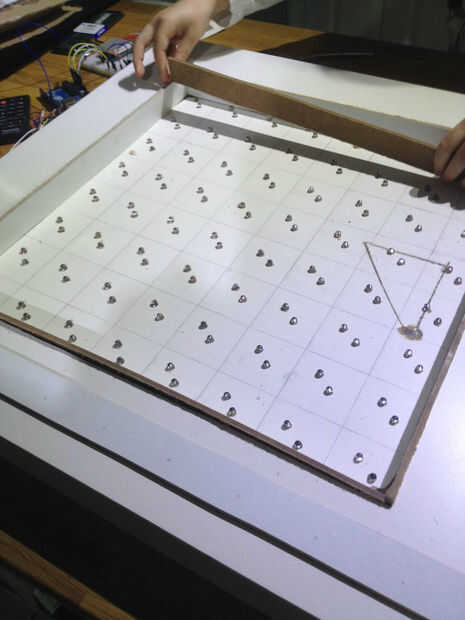 Este guante interactivo utiliza sensores de flexión, tela conductora y un acelerómetro para orientación de la mano de sentido, la curva de cada dedo, y la yema del dedo toca. También tiene un pequeño motor en la palma de la mano de retroalimentación