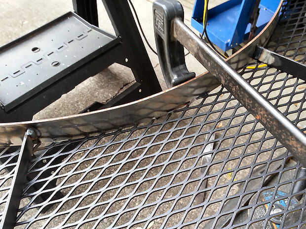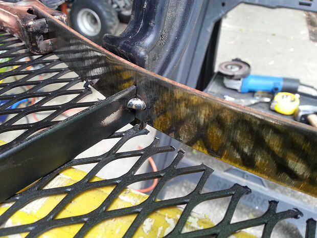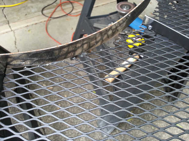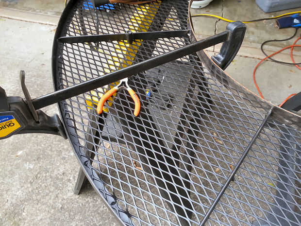 Una soldadura de tachuela en la primera viga de soporte de hierro de ángulo y el plano del tiro barra a la barra plana de acero en lugar de la cerradura. Desde aquí, acabo de poner las pinzas entre las barras de soporte de ángulo de hierro con el fin de tensar el metal que la circunferencia de la abertura, así como mantenerlo encima de firmemente a los soportes de ángulo de hierro. Esto también ahorra los dedos apriete de la abrazadera rápida de la fusión ya que tiende a estar muy caliente (metal fundido frente a plástico y plástico se "siempre pierden"). Asegúrese de que alinee el plano barra con la parte superior de la tabla en el metal ampliado (que actualmente se encuentra en la parte inferior). Cuando le da la vuelta el cuadro posterior "derecho hacia arriba" el piso bar será plana en la parte superior de la abertura. A veces un poco persuasión es bueno con el metal y un martillo pequeño hace el truco.