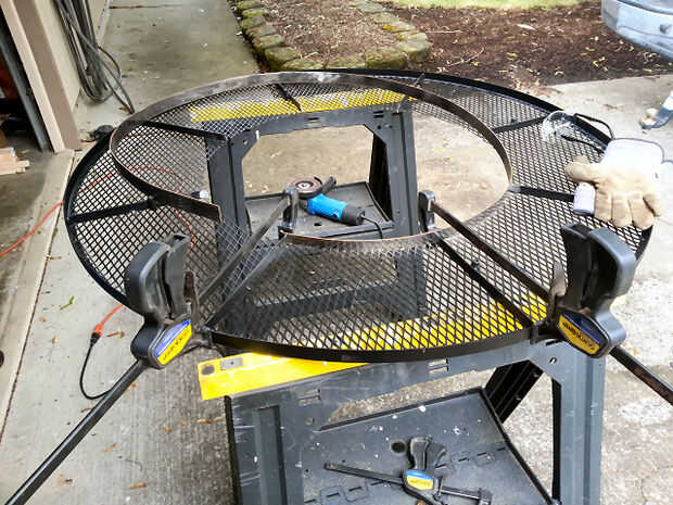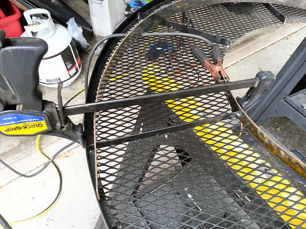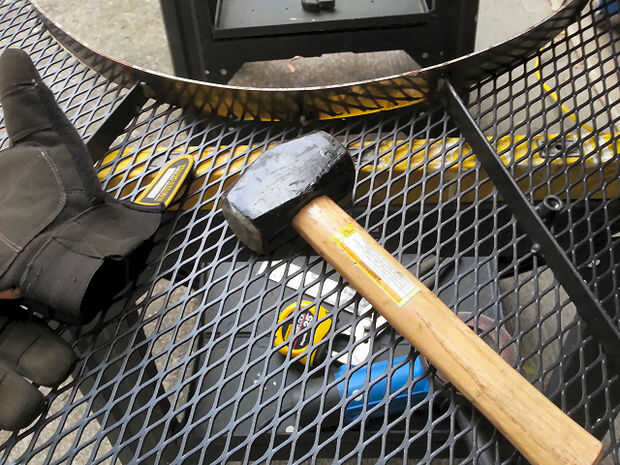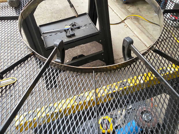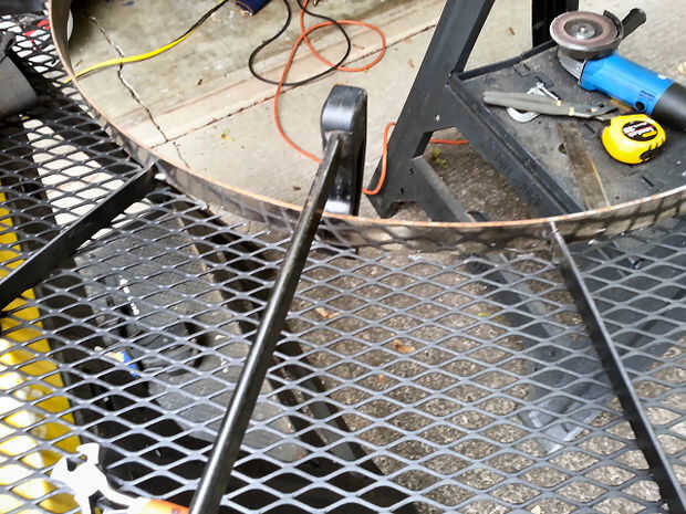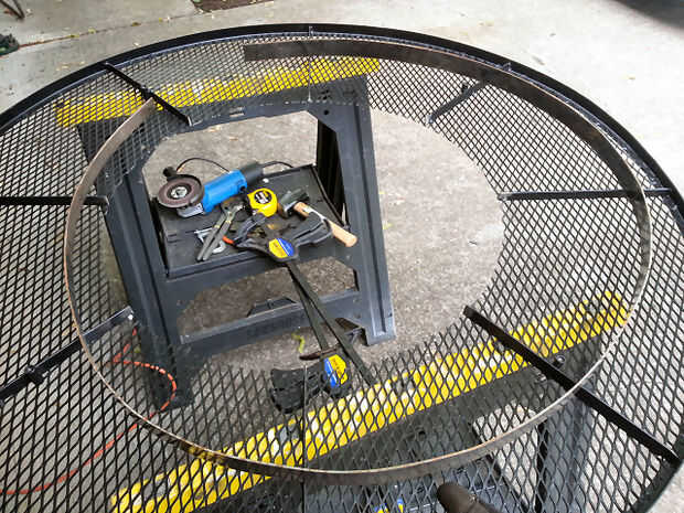 Seguir su forma alrededor de la circunferencia de sujeción entre los soportes de ángulo de hierro de la mesa de trabajo (o de fondo como se está viendo) y virar el plano de la soldadura barra para el ángulo de hierro. Uno tiene la tachuela soldaduras alrededor de la circunferencia de la abertura llegará a un punto donde tienes que superponer el comienzo y el final de la vivienda bar dentro de la circunferencia de la abertura.