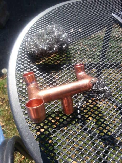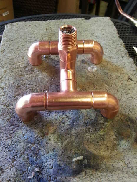 Comenzar cortando varios 1" longitudes de tubo de cobre a utilizar para ajustar el quemador juntos como usted quiere. Fui con un quemador simple 4 salida que más llama la tabla (también mucho de hecho en lo alto!). Comencé con una T y ponga una 1" longitud de tubería de 1/2" en el centro de la T y adjunta la hoja de 1/2" a la guarnición de FP. De los dos extremos he añadido otro 1" longitud de la tubería a dos más T En los dos extremos abiertos de la T poner un codo de 90 grados y luego desde allí otro codo de 90 grados sobre estos tan la llama en todos los puntos de esquina 4 de nuevo en el centro. Probé otro diseño donde los codos de 90 grados todo contrarrestados a la derecha (o izquierda) para crear un poco de relleno de remolino y funcionó muy bien así.