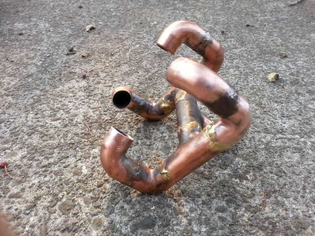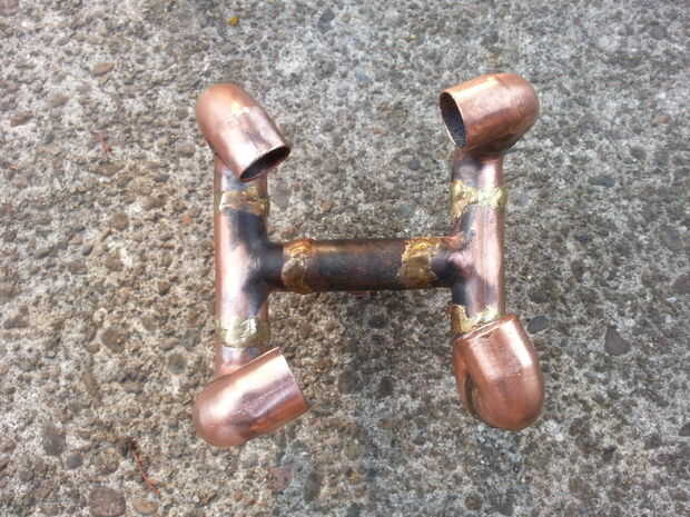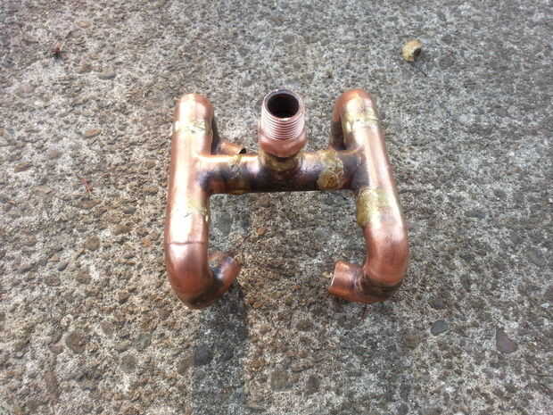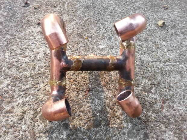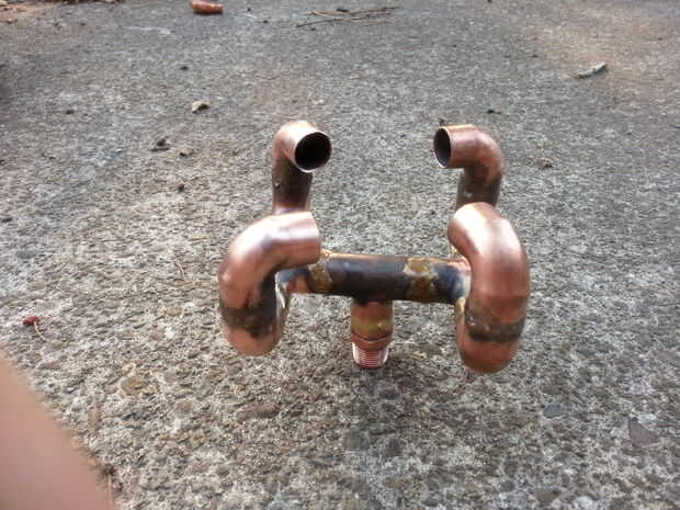 Este diseño tiene los codos de 90 grados superior señalando en el centro, pero el offset para dar un leve remolino y efectos de relleno. No noté mucha diferencia entre este diseño o los codos de 90 grados apuntando a uno con el otro. Cualquiera sea su diseño, usted querrá asegurarse de que todas las juntas están selladas con un relleno que tendrá el calor. El cobre es un gran conductor de calor/frío por lo que se disemina por todo el quemador inmediatamente y calienta rápidamente.