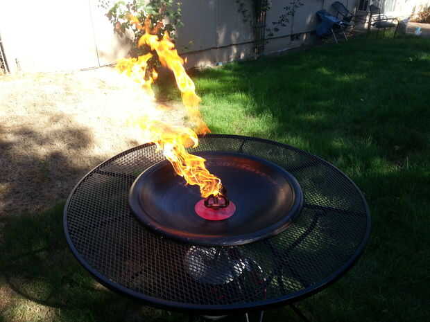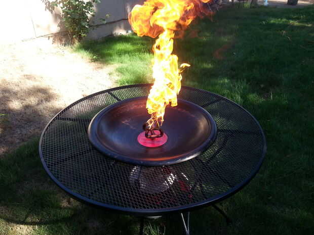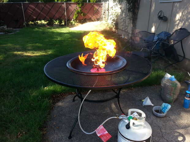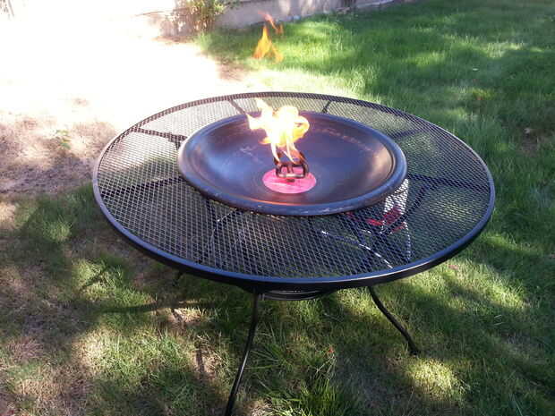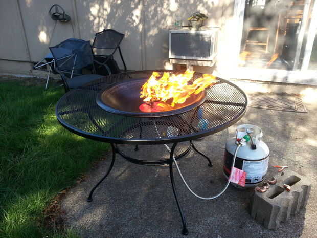 El tazón de fuente en la mesa y conecte la manguera de propano con el accesorio de la parte inferior de la Asamblea de tazón del quemador (suponiendo que pones la mesa juntos ya). Darle un prueba de fuego y ver si es lo que querías. Yo he conectado un par de fotos de las alturas de llama diferente basadas en donde configurar la salida del gas.