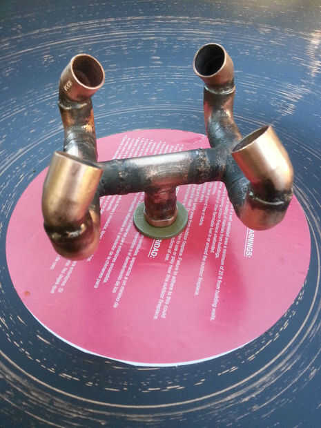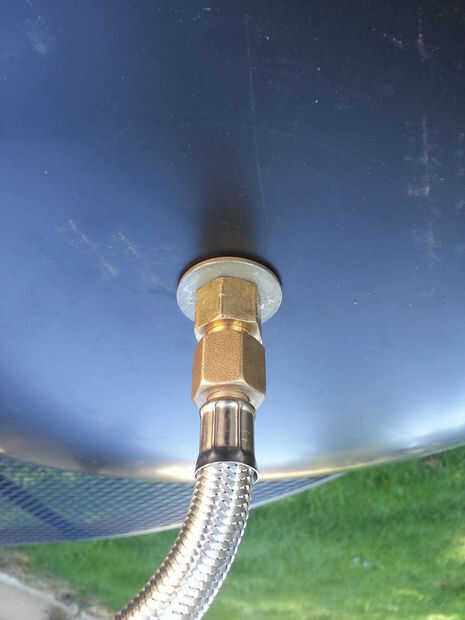 Una vez que el quemador es completado, un taladro de paso a paso en una tienda local (puerto de carga es barata) y perfore un agujero en el centro del tazón de fuente. No recuerdo el diámetro del agujero es, pero sólo avanzar en el taladro de paso a paso y prueba de ajuste sus guarniciones como vas. Una vez que el agujero es del tamaño "correcto", coloque una arandela grande en ambos lados del tazón de fuente, inserte el quemador en el agujero y atornille el accesorio en la parte inferior del recipiente de latón.