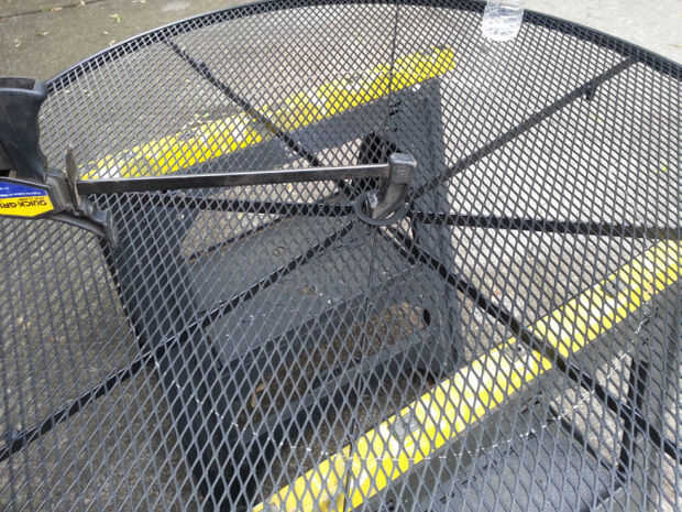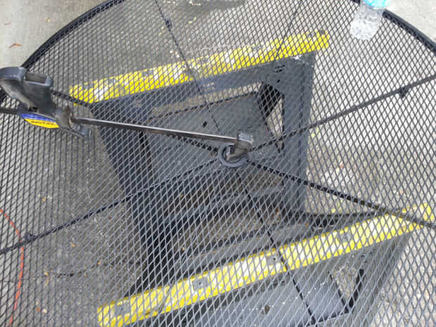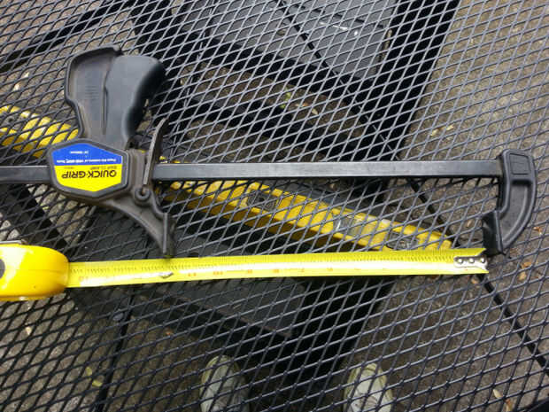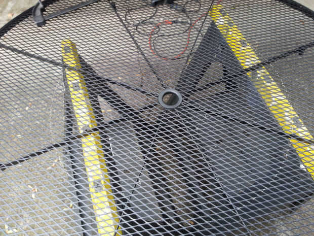 Una vez había medido el recipiente del fuego, aprendí que necesitaba tener un radio de cerca de 11 3/4 pulgadas. Puse mi sujeción a esa distancia, colocada el extremo no de mango en el agujero del soporte de paraguas sobre la mesa y empezaron a ir en un movimiento circular alrededor de la mesa. Usé la Dremel para anotar o frote la pintura lejos donde necesitaba para cortar a través de la tabla. Esto fue hecha sobre todo por el "ojo" como se coloque el extremo de la abrazadera sobre una pieza de metal a cortar, parecía que necesitaba para anotar, mover la pinza y anotó la ubicación con la Dremel. Deja la abrazadera en su lugar se mastique la superficie sujeción y anota la tabla con una Dremel, tan sólo un vistazo rápido, moverse, puntuación funcionó bien para mí.