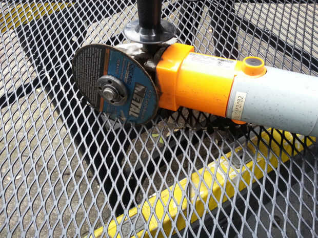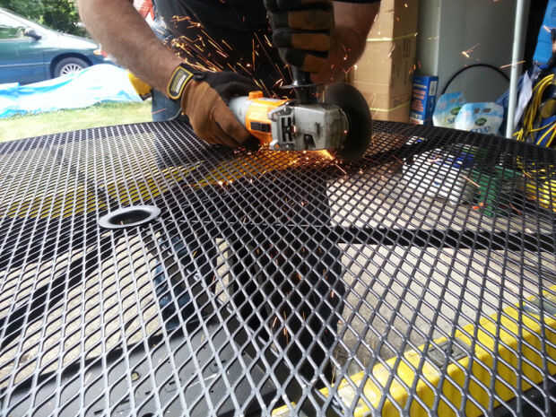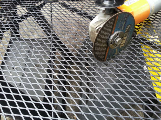 Hora de empezar a cortar. Puede utilizar una serie de herramientas para lograr esto, lo que le sucede que tiene a su disposición. Usé una amoladora con un disco de corte para obtener a través del metal expandido y barras de soporte. Se trabajará una sierra caladora o sierra de sable con una hoja metálica. Como se dijo antes una Dremel funcionaría, pero podría tomar unos cuantos discos para conseguir a través de todos de dicho metal. Un cortador de plasma sería impresionante y hacer un trabajo "rápido" de metal! Todo lo que tenga que recortar el agujero debería funcionar... Incluso puedes ir de vieja escuela y usar herramientas de mano!