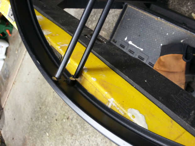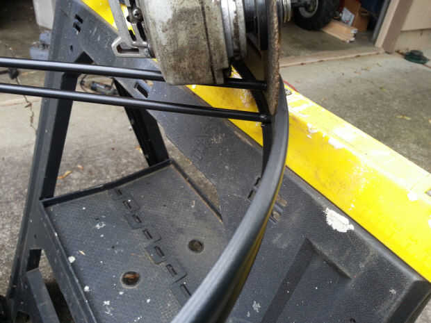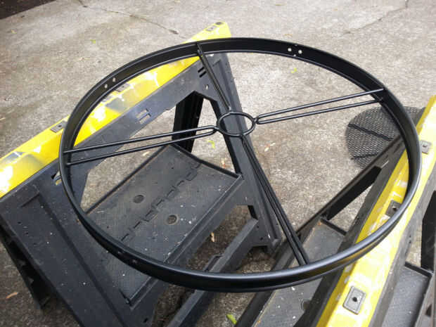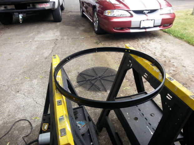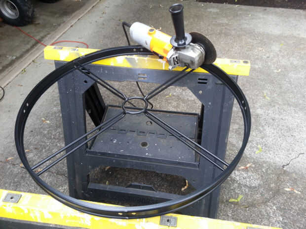Esta tabla tiene 8 cortes que deben hacerse. Tómelo lento, corte cerca, pero no en la parte superior del marco. Puede moler nuevamente los talones que quedan sin dañar el anillo exterior. Una vez que se cortan las barras de soporte, basta con retirar el apoyo de paraguas.