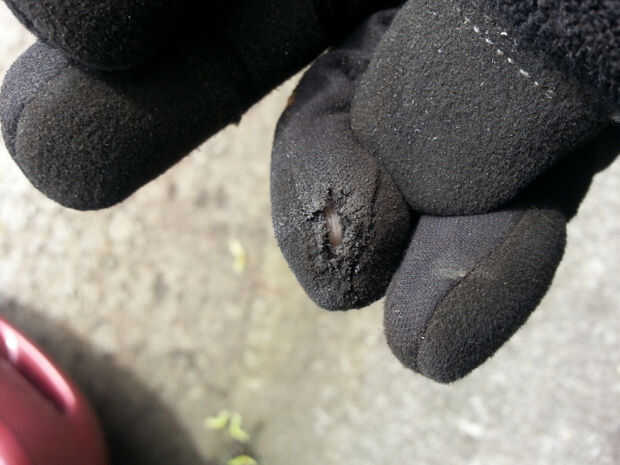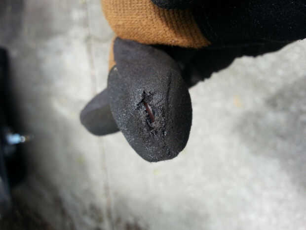 Me fue cortando en la mesa y notó que mi dedo estaba poniendo bastante caliente. Pensé, "tengo guantes en, no es gran cosa," y mantiene en corte. Mi dedo mantenido cada vez más caliente y más caliente y pronto suficiente comprobé cuál era el problema (en mi disgusto tener que detener mi avance). Pronto aprendí había quemado a través de la piel y comenzó a quemar la punta de mi dedo con "todas las chispas de metal caliente!" También noté que mi dedo aún ardía como el guante estaba en llamas. Ni que decir cambiar las posiciones de las manos y continuó.