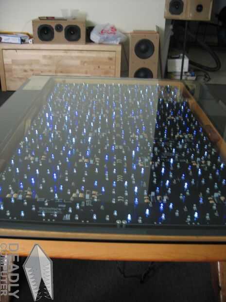 Aquí está un video de mi mesa final en acción en la oscuridad y una foto de lo que parece: