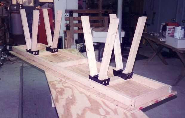 Sección de tableros están hechos de dos piezas 2' por 8' Ripeado de un pedazo de madera contrachapada gruesa de 3/8 de pulgada. No puedo comprar madera contrachapada plana, así que en lugar de usar 3/4 de pulgada pegamento y clavo juntos de manera que su warpages y giros contrarrestar mutuamente las dos mitades de la hoja más fina. RIM se hace de la madera vendida en casa centros como "montantes" reales 1-1/2" por 2-1/2". Madera contrachapada Nota voladizos laterales de llantas por 2-1/2" para la fijación de las abrazaderas de proyecto, etc.. Uno de los extremos de la parte superior de cada sección sobresale su marco por 3/4,"mientras que su otro extremo cataratas corto 3/4." Cuando dos secciones están bien atornilladas, la superposición de esto gran parte de una tapa sobre el marco de la sección de otras ayuda a la plana superior montada. No se muestra en esta foto, dos agujeros correspondientes se perforan a través de los extremos del marco para que las secciones de la tabla se pueden tirar firmemente junto con estufa pernos, arandelas y tuercas de mariposa.