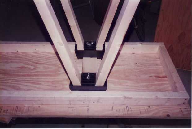 Los bloques de plástico negro se venden en pares por el hogar y Ferreterias para hacer Sierra de caballos. Un perno se mantenga un bloque a un extremo de una tapa de caballete quitase y también mantenga una cuña de plástico que se sujeta las piernas quitase. Permanentemente un travesaño de dos por cuatro en cada extremo de cada sección de la tabla. Opté por usar la madera de "stud" más pequeño para las piernas, así que corte bloques pequeños, apenas visibles este lado de la pareja lejos de piernas en la foto, rellenar el espacio. Perforé un hueco en la parte superior de la mesa para cada bloque de plástico, así que cabeza redondeada de un perno de estufa no sobresalir de la parte superior. Una tuerca de mariposa en el extremo de cada perno tiene el bloque en su travesaño quitase y también las abrazaderas de las patas firmemente en su lugar. Retire las tuercas y los pernos y los bloques se desprenderá de la mesa y las piernas saldrán de los bloques, haciendo todo fácil de almacenar. Las piernas pueden almacenarse en el hueco debajo de la mesa.