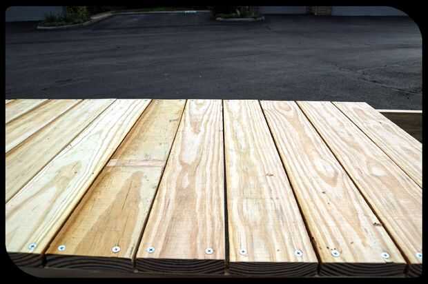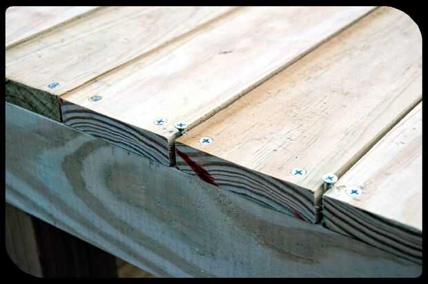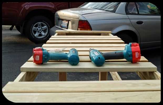 Uno de los tornillos de 1.5" y pulse en el marco de la tabla al espacio la próxima Junta. En ambos extremos del tablero y luego pasar a la siguiente junta, autoroscante en a espacio de manera uniforme las juntas. Porque estos son tornillos de #10, este espacio asegura que diecinueve juntas exactamente 70" de ancho. Una vez que tengas las juntas espaciadas, simplemente trabajar desde un extremo de la mesa a la otra, el lavado de placas de sujeción, perfore agujeros guía y luego perforación 24" juntas con tornillos de 1.5". Una vez más, tener dos taladros inalámbricos hace de este un proceso mucho más rápido, un taladro para los agujeros, una perforación para los tornillos.