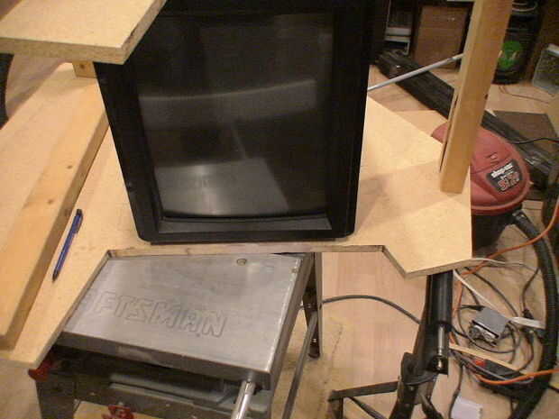 - Y 2 2 x 4 soportar el monitor, con la línea trazada cuando ajuste el monitor de prueba coloca un 2 x 4 para arriba hacia los controles en la parte frontal del monitor y una parte posteriora más lejana, pero no completamente porque es donde la PC se accederá desde. Por lo tanto un