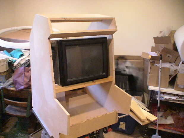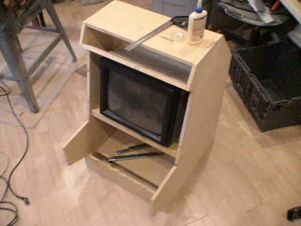 -Con el monitor en el gabinete sacar figura qué agujero tamaño para cortar la madera prensada y donde ponerlo exactamente. Su crítica a medir correctamente, tal vez incluso hacer una maqueta de cartón antes de pasar al siguiente paso.