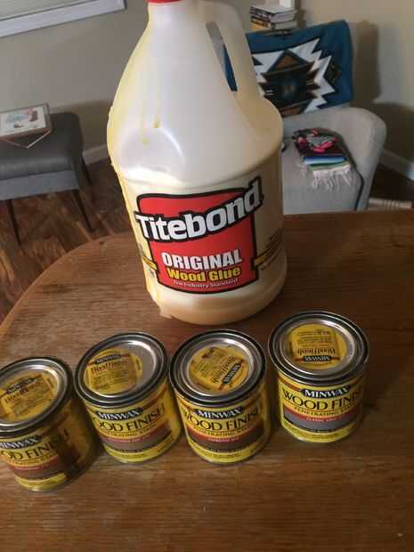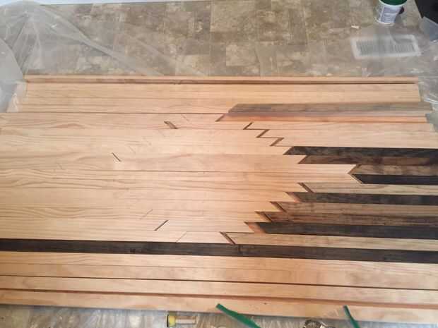 Esto es donde saltó el arma. Yo había ya cortar todas las tablas para ajustar la base. Debería haber esperado hasta después de hecho el grado 45 cortes como se retira el material y luego tuve que recortar los bordes. Curva de aprendizaje que supongo. Así que nos fuimos directamente a las manchas. Hemos elegido 4 manchas de madera diferentes. Al azar nos mancharon todas las piezas excepto el centro. Con sólo 4 colores puede hacer muchos matices aprendí! Pincel en un color claro y oscuro. O pincel en un color y limpie inmediatamente para darle que parece un encendedor. Me gustó mucho esto. Por cierto, la mayor parte de esto se hizo dentro de como no tenemos un garaje y está muy frío afuera. Establecidas de plástico, abrió ventanas y llevaban respiradores mientras la coloración. No la diversión en el interior pero eso es lo que teníamos que trabajar con.