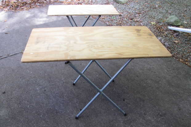 este tutorial le mostrará cómo hacer tablas portátiles que son fáciles de instalar y apenas el tamaño correcto para el arte muestra, ventas de garage, mercados de pulgas o tablas adicionales sólo para el acabado. Mi esposa necesita mesas portátiles para su muestra de arte. Arte de mostrar espacios varían en tamaño, por lo que ella me pidió que crear dos tamaños diferentes. Empecé a hacer estas tablas hace unos ocho años y me rutinariamente las solicitudes para obtener instrucciones sobre cómo hacerlo.