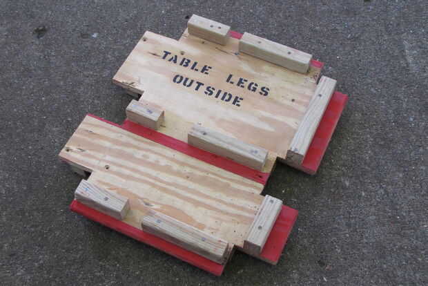 Nota: Si usted planea en hacer más de un juego de piernas de la tabla para cada tamaño, recomiendo crear una plantilla para la soldadura. Estoy incluyendo un par de fotos de la plantilla que hice para este propósito. La plantilla es dos caras y tiene dos partes a cada lado. Cada lado tiene 'plantillas' para las piernas exterior para ambas tablas de tamaño y el lado opuesto 'plantillas' para el interior las piernas para ambas tablas de tamaño, ver fotos. Las áreas rojas indican donde el conducto se debe colocar y afianzado con abrazadera para soldadura (abrazaderas han sido removidas en la foto con el conducto). He hecho tablas durante varios años y todos son uniformes.