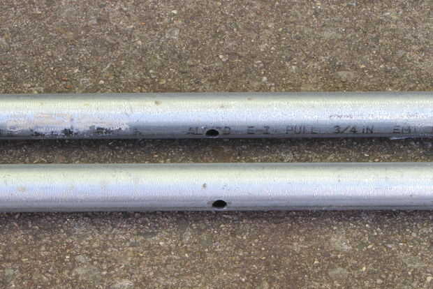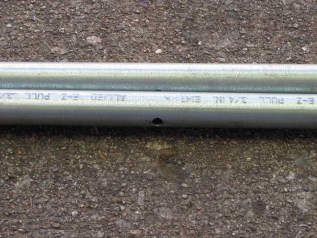 Poner el interior de la pierna de sección dentro de la sección de la pierna exterior permitiendo que la octava parte de una brecha de pulgada entre las porciones superior (incluye un sistema de piernas que desmontado parcialmente para mostrar este paso). Medida 17 ¾" abajo de la pierna fuera de la parte superior y marque el lugar para perforar un agujero de ¼". Para asegurar que el perno agujeros coincidan perfectamente, yo generalmente abrazadera interior y exterior piernas juntos mientras taladra en mi taladro de piso (dejar las piernas 'colgar' a continuación). Mientras que los agujeros se pueden perforar usando un taladro de mano, he encontrado mucho más fácil de perforar con un taladro de piso porque la gravedad ayuda a mantener el interior y fuera de las piernas alineadas durante la perforación. Después de taladrar los orificios deben buscar similares a los de la foto.