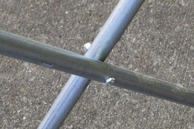 Inserte un perno y asegure con una tuerca de seguridad. Nota: ¼" arandelas podrían utilizarse entre las piernas, sin embargo he encontrado que realmente no es necesarios.
