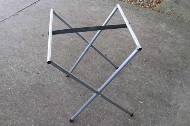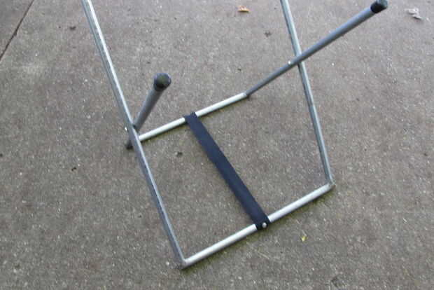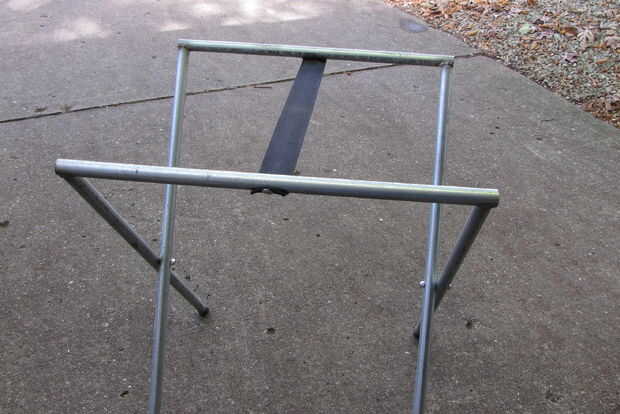 La correa se coloca en la parte inferior de las patas de la mesa y se fija con remaches pop. Una manera fácil de fijar la cinta es girar las patas de la mesa boca abajo. Perfore un orificio de centrado en las dos secciones para un remache pop (ver foto de posición). A continuación extiende las secciones piernas separadas hasta que la distancia desde la parte inferior de la pierna hasta el suelo mide 30". Mida la distancia entre cada agujero que ha perforado y añadir 1 ½" a la medida (aproximadamente 24" para la tabla más grande y 19" de la tabla más pequeña). Corte una longitud de correas para que la longitud y doblar cada extremo ¾" y sujete con un remache pop. Debería ver algo como la foto.