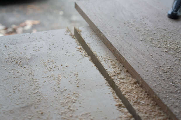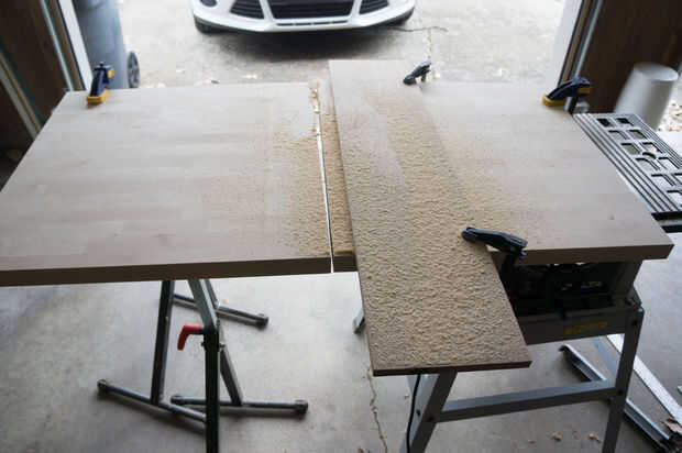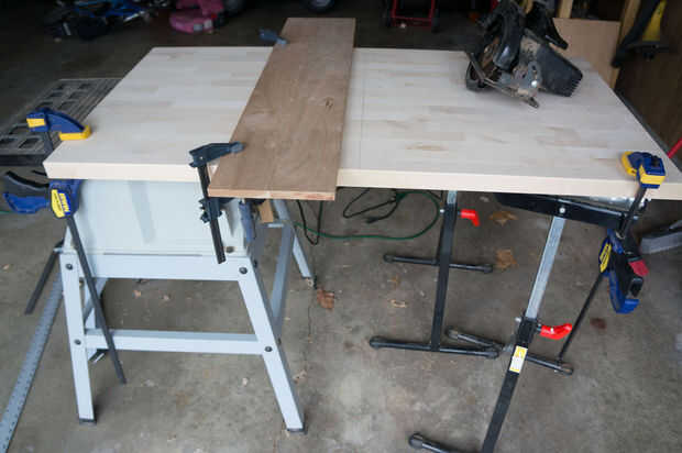 Mi sierra de mesa es demasiado pequeña para fiable hacer la Cruz primera corte, usé mi sierra circular. Corté el tablero por la mitad, haciendo dos piezas que eran aprox. 25 "x 24". Sujeta una tabla recta a la pieza de trabajo una regla recta y funcionó la sierra circular contra él para un corte recto. Tiene un poco de arranque al final del corte, pero sabía que fresar los cantos probablemente cuidaría de él.