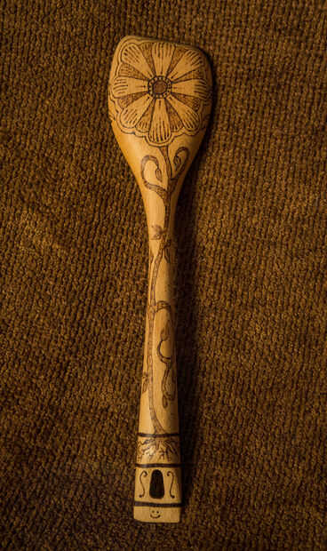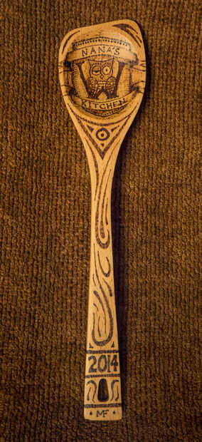 Oh, te prometí una cuchara. Mi esposa compró una cuchara de madera sin terminar en una tienda llamada T.J. Maxx por $4.99. Doodled en él con un lápiz y me hizo la leña. Digo aprovechando las superficies curvas fue desafiante con quemador madera y lápiz. Me gustaría hacer más de estos, pero hasta ahora este es el único que he hecho.
