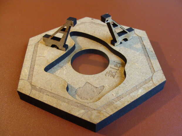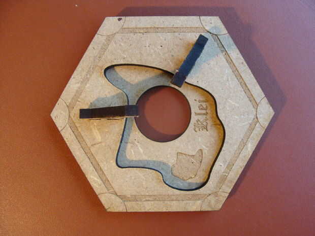 En primer lugar, cortar todas las piezas con la impresora láser y pegar los dos hexágonos a unos de otros que la palabra 'Arcilla' es aún visible. Cuando el pegamento ha secado, coloque una pequeña gota de pegamento en la parte inferior de la crains (no demasiado o el pegamento fluirá sobre los orificios!). Normalmente, debe encajar perfectamente en los dos orificios que sirven para sostenerlas.
