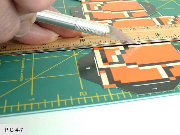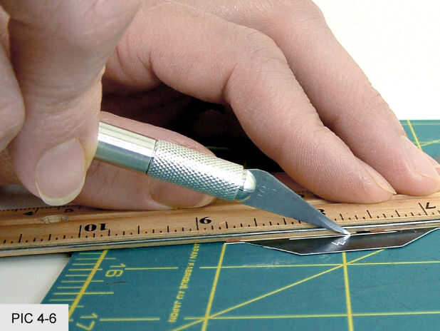 Para producir curvas limpias, utilice una regla y el borde posterior de la cuchilla de hobby para todos los bordes que serán doblados. Esto incluye los bordes de cada panel y todas las fichas. Mantenga el cuchillo de la manía en un ángulo plano y utilizar una presión firme durante la veintena. (PIC PIC DE 4-6, 4-7)