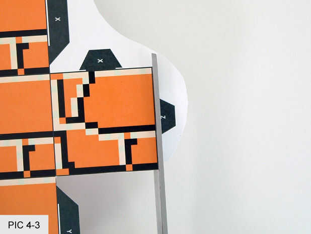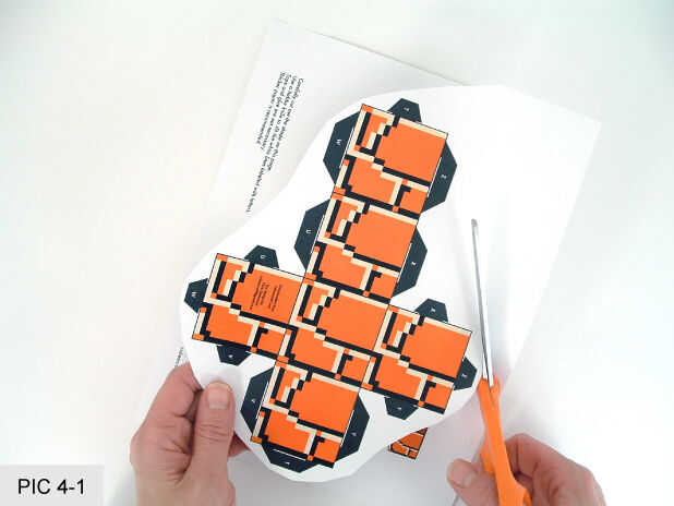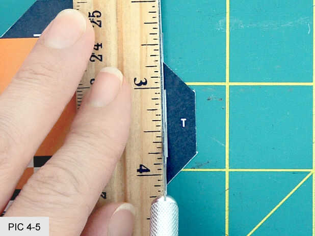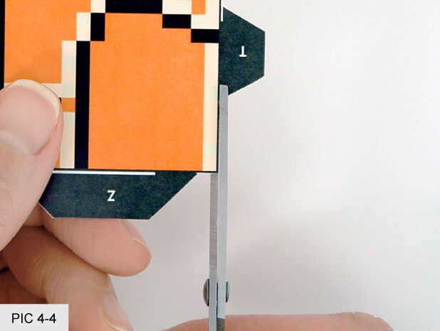 Utilice un gran par de tijeras para retirar rápidamente el exceso. (FOTO 4 - 1) Utilice un pequeño par de tijeras para cortar cuidadosamente la obra de arte. (FOTO 4-2) Si usted decide utilizar el pegamento, corte las pestañas pequeñas. (FOTO 4-3) Si usted decidió no usar pegamento, cortar los extremos de las pestañas pequeñas y utilice una regla y un cuchillo de la manía para cortar las ranuras para las pestañas. (PIC PIC DE 4-4, 4-5)