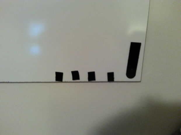 Los marcadores llevaron un poco más de preparación. Tomé uno más fijar y cortar en tiras de 1/2". Dos de estas tiras fueron utilizados por todos los cuatro marcadores. Aplicó a la Junta y el marcador por separado puesto que los marcadores son redondos y el tablero es plano. Que probablemente podría han tomado un poco más tiempo y hecho ellos se alinean muy bien a lo largo del borde inferior de la Junta, pero está trabajando para mí.