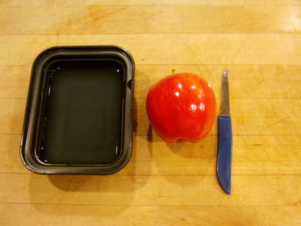 -recipiente pequeño de agua con algunas gotas de jugo de limón mezclado dejar la manzana del dorado