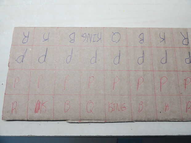 Recortar un 8 pulgadas por 4 pulgadas de cartulina y cortar por la mitad en la mitad sería piezas blancas y el otro sería negro. Usted necesita 8 peones, 2 torres, 2 caballeros, 2 obispos, 1 Reina y 1 rey para el blanco y hacer lo mismo para el negro. NO OLVIDE PERSONALIZAR EL BLANCO Y EL NEGRO PARA RECONOCER QUE ES BLANCO Y QUE ES NEGRO. Utilicé iniciales para él.