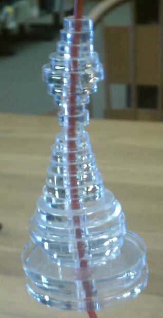 OK, tiempo para hacer algún montaje de pieza final. Barras de acrílico cortadas a la longitud de las piezas. Coloque el anillo inferior en la varilla de acrílico. Bajar todos los anillos en la misma. Encaje a presión el anillo superior.