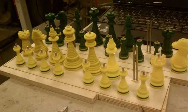 También probé otro enfoque para temporalmente manteniendo los anillos en orden y transporte. Construí un pegboard fuera un pedazo de madera y algunas secciones de 0,120" varillas de acero de diámetro. Puedes ver algunas piezas amarillas y verdes en las clavijas en el cuadro 2. Usted querrá presentar los extremos de las barras para que las piezas no enredarse en las fresas.