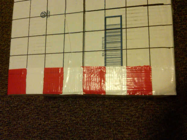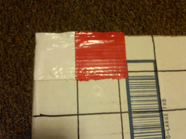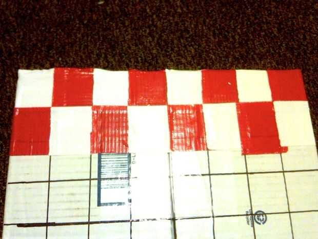 El siguiente paso es el proceso de superposición repetidamente cuadrados de cinta diferentes colores uno encima del otro para crear un patrón repetitivo de alternando colores que corresponden a la red creada en el paso anterior. Para comenzar este patrón, cortar un trozo de cinta blanca que es un poco más grande y una sola plaza. Colocar en una esquina de la cuadrícula con el objetivo de colocarlo como cerca en línea con el borde como sea posible. A continuación, corte un cuadrado de tamaño igual de una cinta de ducto color diferente (rojo en las fotos) y colóquela a lo largo de la línea de la cuadrícula que se puede ver a través de la cinta blanca. Ambas plazas superpondrán ligeramente las líneas de cuadrícula. Esto está bien, como la cinta más se asegurará de que ninguno de la caja de muestra a través de entre las piezas. Continuar este patrón a lo largo del resto de la red hasta que haya terminado la fila. (Ver imagen de aclaración) Doblar la cinta adicional al final de la fila y girar su atención a donde usted comenzó.