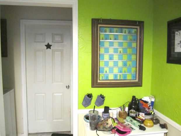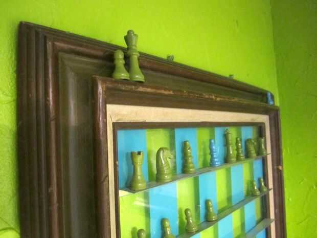 colgué mi tablero junto a la puerta de atrás para que mi esposo y yo podemos jugar cada día con una jugada cuando salimos para el trabajo y uno de cuando inicio. Piezas que se han tomado Haz colocados en la parte superior del marco.