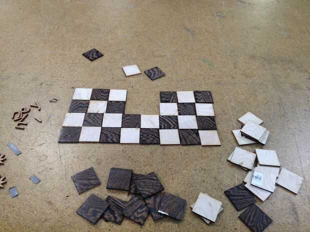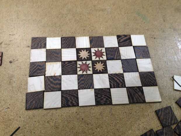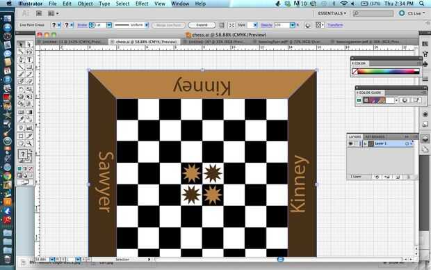 Paso 1: Empecé con una rejilla en Illustrator y había creado las plazas a 1.5", entonces una vez que había creado el tablero con 64 casillas, he creado una frontera para poner su nombre. Puede descargar el archivo y cambiarlo, por supuesto. Luego añade las estrellas del centro, había seleccionado todo y utiliza la función pintura interactiva para el color.