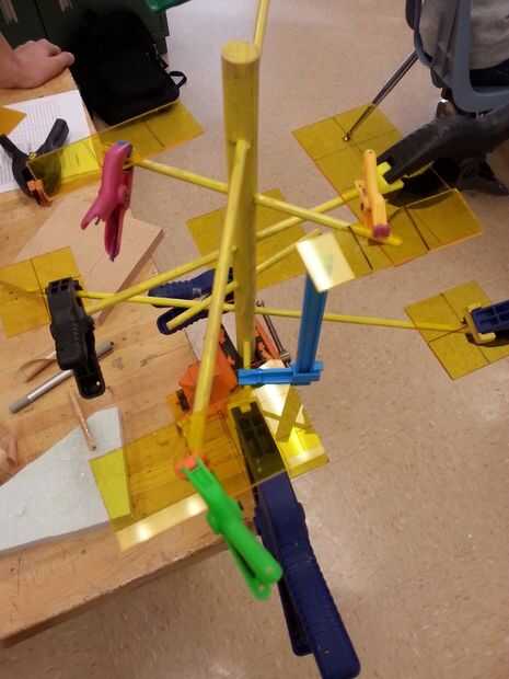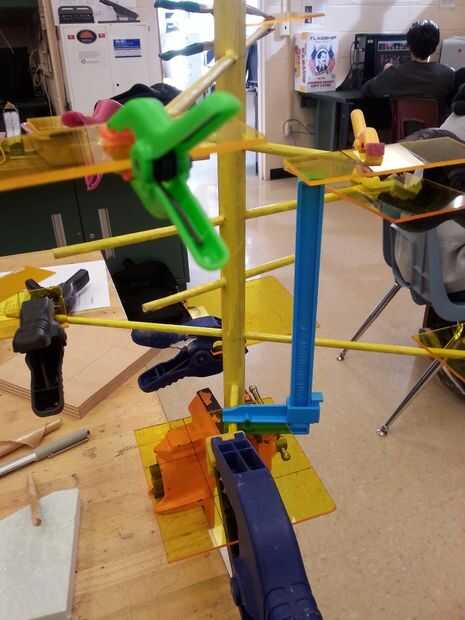 Había cortar cada pieza de ajuste de la Junta (acrílico) y hecho las líneas de separación clara con un marcador de sharpy. Quería cada espacio en el tablero del grabado del laser, pero no tenía tiempo suficiente debido a la afluencia de personas que desean utilizar el grabado del laser para sus propios proyectos. Pero de todos modos, he utilizado el marcador sharpy. Todavía hizo su trabajo separando cada espacio... Até cada sección de la Junta en su plataforma con pegamento epoxi. Y los asegurados con abrazaderas. Después de secar al final el resultado fue un buen modelo de lo que realmente quería construir.