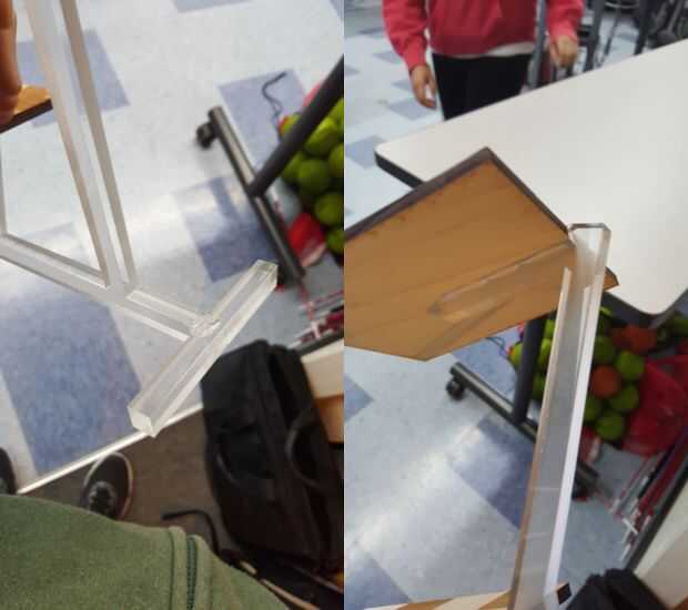 El soporte de acrílico tiene pequeños bares a caliente pegamento las juntas fijas en. Usted puede verlo en la segunda mitad de la segunda foto. Pegar estas en el lugar y asegúrese de que esté nivelada.