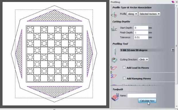 3. Seleccione el mismo grupo de vectores y el vector cuadrado alrededor del borde de la cuadrícula. Crear una trayectoria de perfil a lo largo de estos vectores con 90 grados V-bit herramienta corte a una profundidad de 1mm en orden el chaflán de los bordes agudos creados en la trayectoria de herramienta anterior