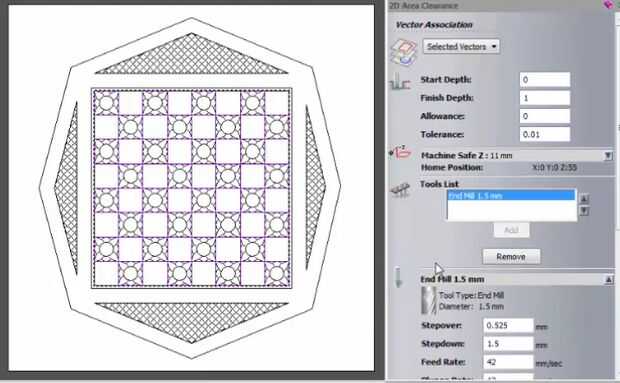 1. Seleccione el grupo de vectores cuadrados que conforman la red de ajedrez y utilizar la herramienta de crear trayectoria de limpieza de área con una profundidad de arranque de 0mm, una profundidad final de 1mm y un molino de extremo de 1,5 mm seleccionados y calcular para crear alturas alternadas a las plazas