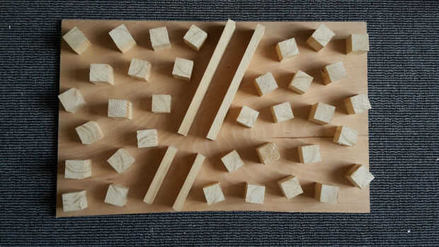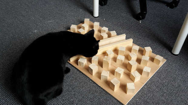Esta es una tabla de alimentación para gatos - pones golosinas entre los obstáculos para el gato a pescar, es bastante straighforward realmente. Pueden ser construido de cualquier piezas de madera pueden ser sobrantes de proyectos anteriores. No recomiendo usar un diseño que tiene esquinas, porque trata tiende a atascarse en ellos (he construido un prototipo que fue más laberíntico, y absolutamente no funcionan según lo previsto). Pequeños bloques de madera bastante bien, sólo asegúrese de que hay suficiente espacio entre ellos para el gato de patas pero no hay suficiente espacio para la cabeza del gato.